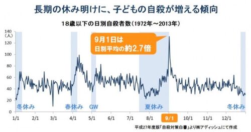 ●休み明けに子どもの自殺が増える http://mamapicks.jp/archives/52207130.html より 子どもの自殺が増えるのは長期の休みがあける前後。 休み、冬休みやゴールデンウィークの初期や中期には比較的自殺は少ないようです。 これって子どもにとって学校という…